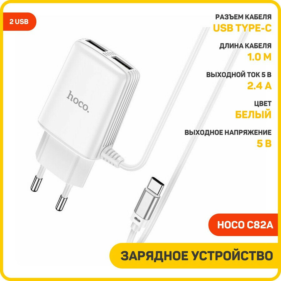 Купить Сетевое зарядное устройство (СЗУ) Hoco C82A (2 USB) + кабель Type-C, 2.4 А, белый