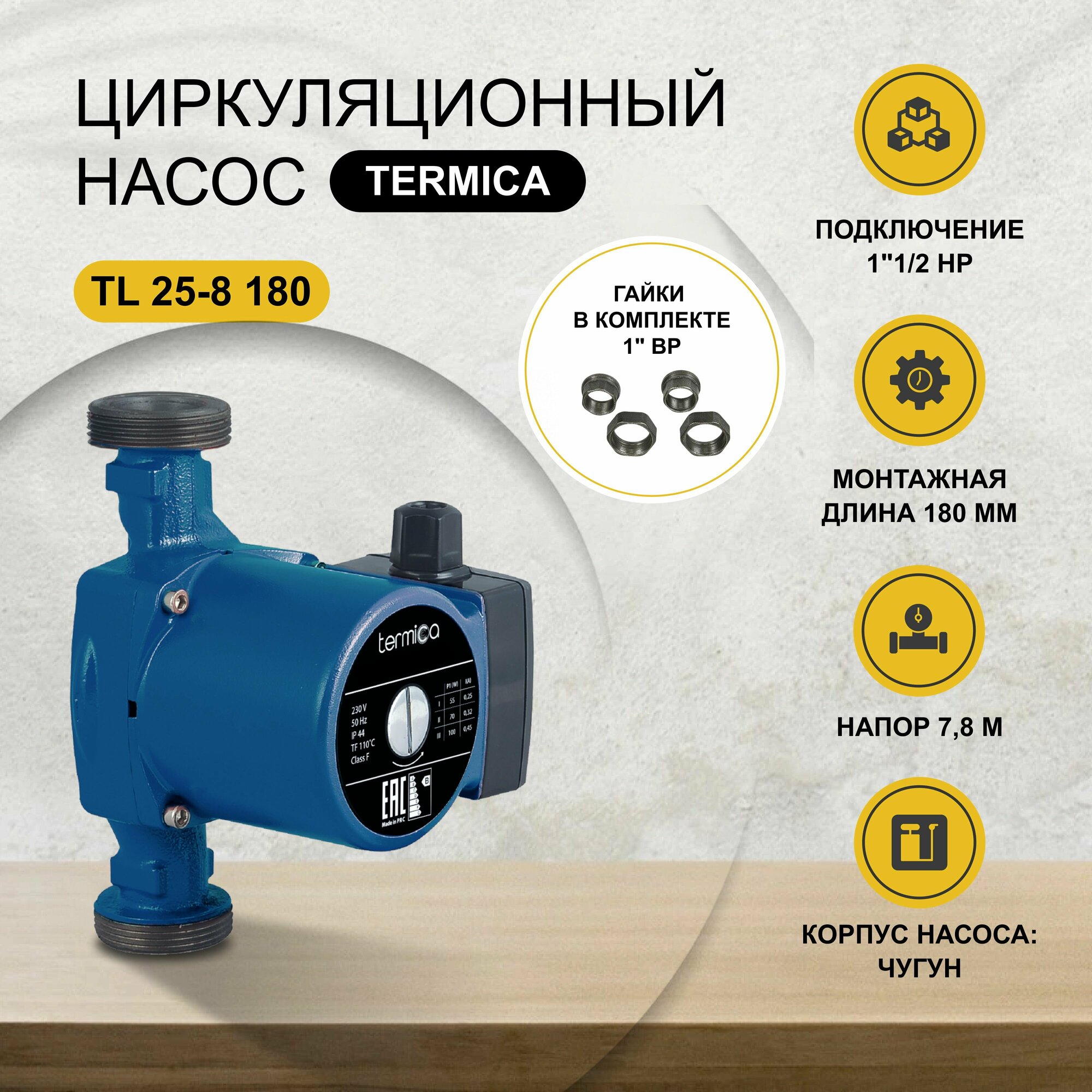 Насос циркуляционный TERMICA ТL 25-8 180мм (в комплекте с гайками) для отопления
