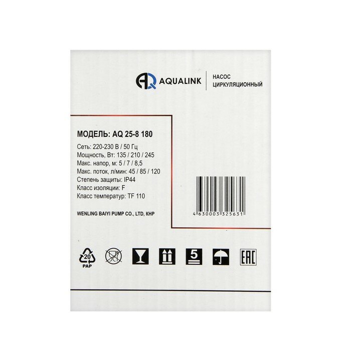 Насос циркуляционный Aqualink 25-8 180, напор 8 м, 120 л/мин Aqualink 7805310 .