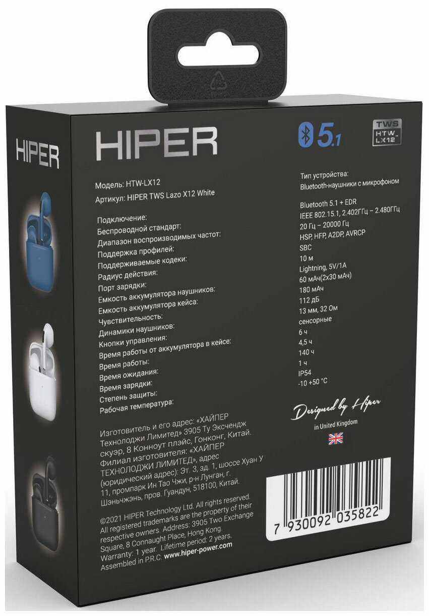 Беспроводные наушники HIPER TWS Lazo X12 White (HTW-LX12) Bluetooth 5.1 гарнитура, Белый