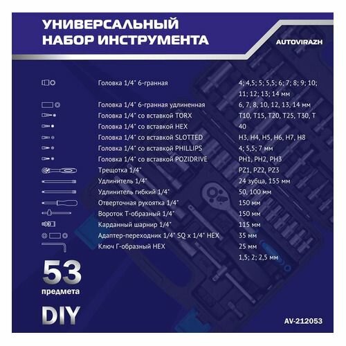 Набор инструмента AUTOVIRAZH 53 предмета, 1/4"DR AV-212053