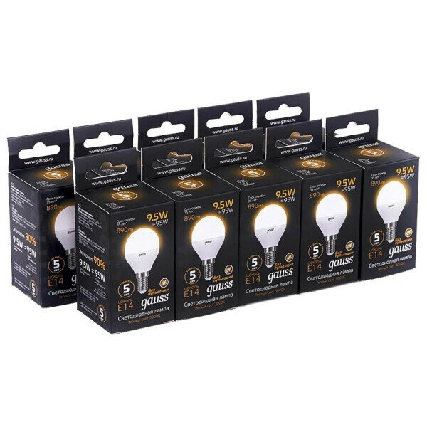 Упаковка ламп LED GAUSS E14, шар, 9.5Вт, 3000К, белый теплый, 10 шт. [105101110]
