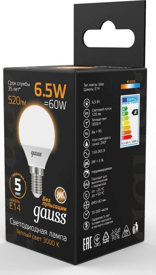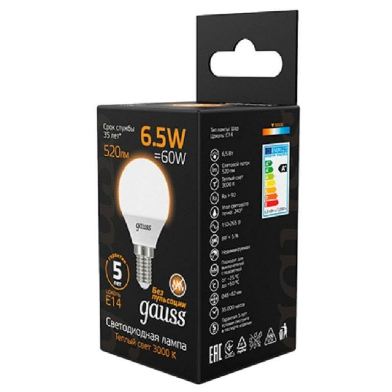 Gauss Лампа Шар 6.5W 520lm 3000K E14 LED