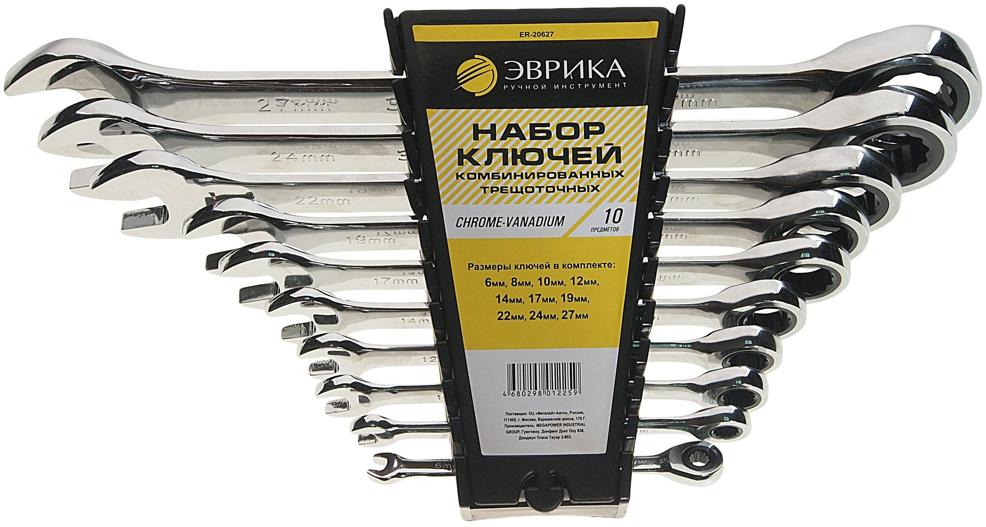 Эврика ER-20627 Набор ключей комбинированных 6-27мм трещоточных 10 предметов в холдере эврика