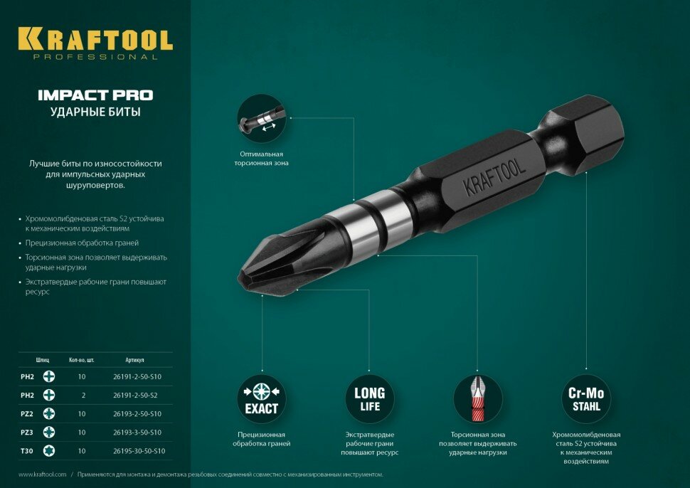 Биты KRAFTOOL Impact Pro, Philips, тип хвостовика E 1/4″, PH2, 50мм, 2шт, на карточке интересное: