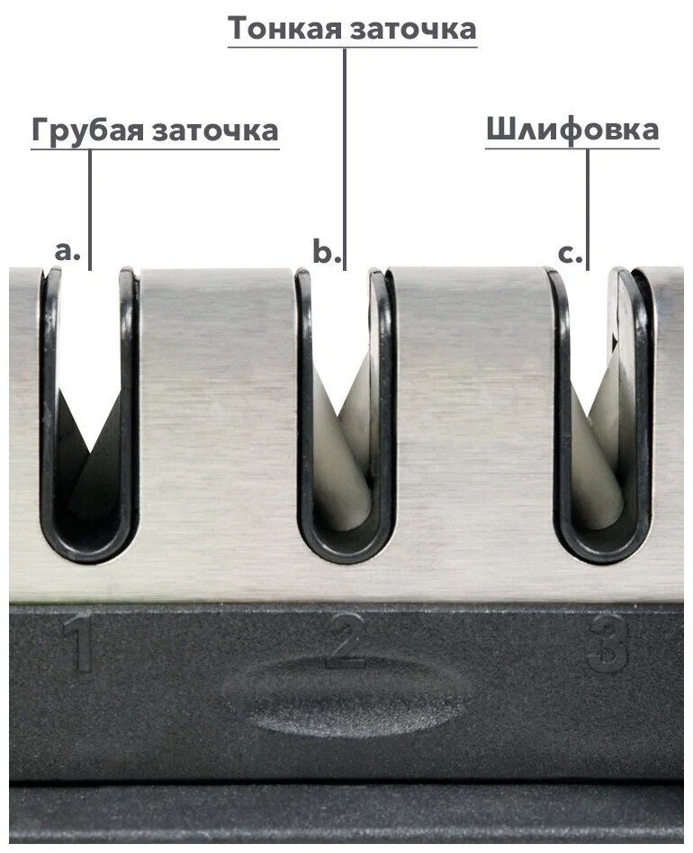 3 зоны заточки ножей. Зона 1 - грубая заточка (вольфрамовая сталь). Зона 2 - деликатная заточка (керамика среднезернистая). Зона 3 - доводка лезвия до идеальной остроты (керамика среднезернистая)