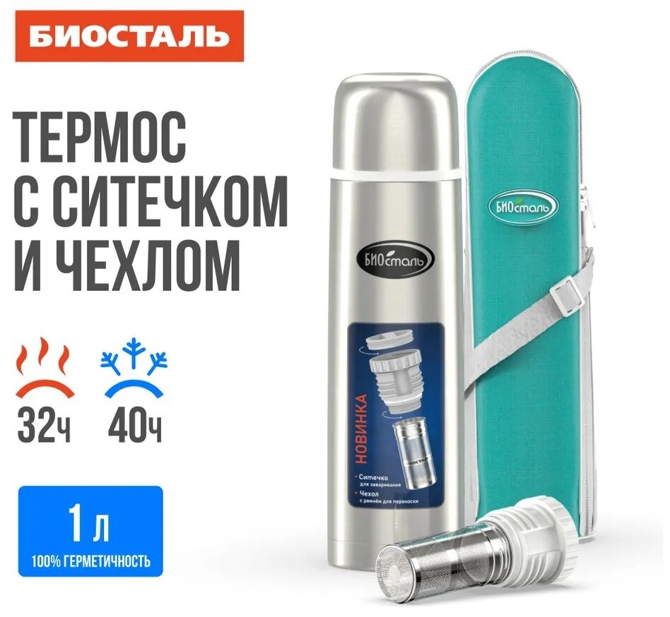 Термос Biostal (1 литр), с ситечком и чехлом, стальной