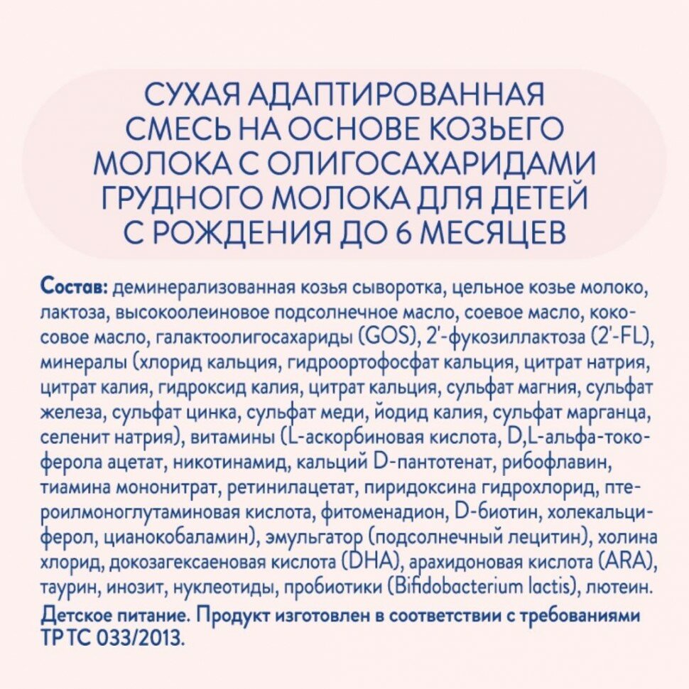| Состав | деминерализованная козья сыворотка, цельное козье молоко, лактоза, высокоолеиновое подсолнечное масло, соевое масло, кокосовое масло, галактоолигосахариды (GOS), 2'–фукозиллактоза (2'–FL), минералы (хлорид кальция, гидроортофосфат кальция, цитрат натрия, цитрат калия, гидроксид калия, цитрат кальция, сульфат магния, сульфат железа, сульфат цинка, сульфат меди, йодид калия, сульфат марганца, селенит натрия), витамины (L–аскорбиновая кислота, D, L–альфа–токоферола ацетат, никотинамид, кальций D–пантотенат, рибофлавин, тиамина мононитрат, ретинилацетат, пиридоксина гидрохлорид, птероилмоноглутаминовая кислота, фитоменадион, D–биотин, холекальциферол, цианокобаламин), эмульгатор (подсолнечный лецитин), холина хлорид, докозагексаеновая кислота (DHA), арахидоновая кислота (ARA), таурин, инозит, нуклеотиды, пробиотики (Bifidobacterium lactis), лютеин |