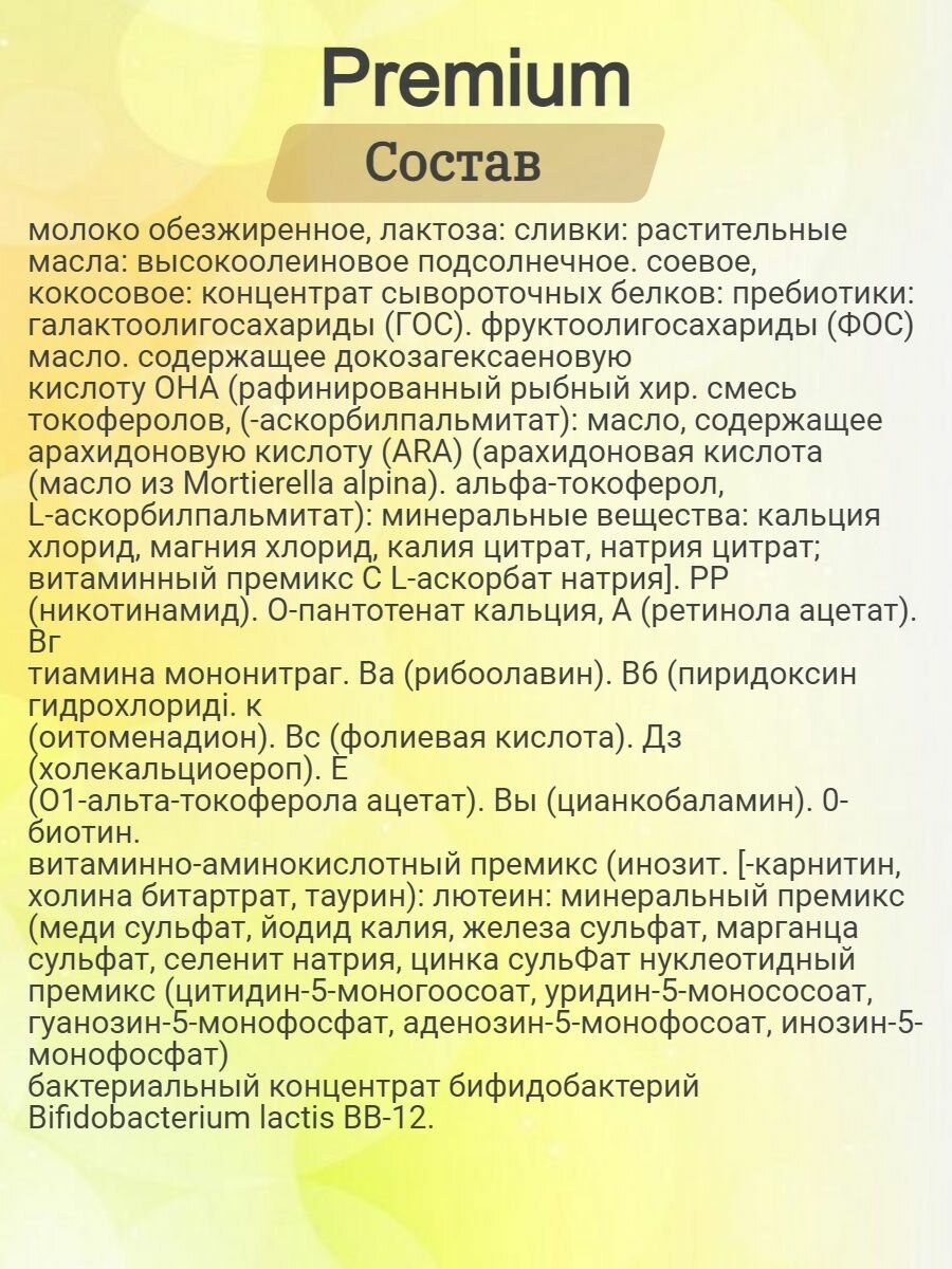 | Состав | молоко обезжиренное, лактоза, сливки, растительные масла (высокоолеиновое подсолнечное, соевое, кокосовое), концентрат сывороточных белков, пребиотики (олигогалактоза (ГОС), олигофруктоза (ФОС)), содержащее докозагексаеновую (DHA) кислоту масло (рафинированный рыбий жир, смесь токоферолов, аскорбил пальмитат), содержащее арахидоновую (ARA) кислоту масло, минеральные вещества, витаминный премикс, витаминно-аминокислотный премикс (инозит, L-карнитин, холин, таурин, лютеин, минеральный премикс, нуклеотидный премикс (цитидин-5'-монофосфат, уридин-5'-монофосфат, гуанозин-5'-монофосфат, аденозин-5'-монофосфат, инозин-5'-монофосфат), бактериальный концентрат бифидобактерий Bifidobacterium lactis BB-12 |