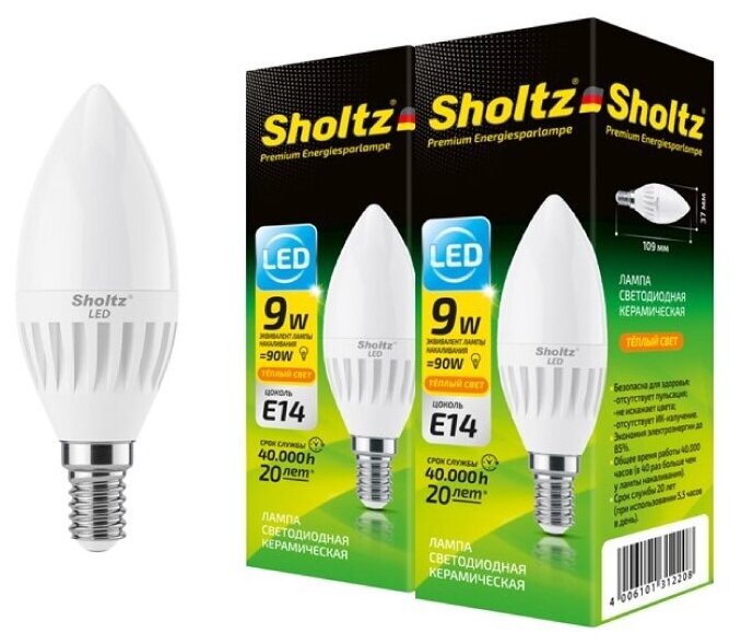 Комплект из 2 светодиодных энергосберегающих ламп Sholtz свеча С37 9Вт E14 2700К 175-265В керамика (Шольц) LEC3122D интересное: