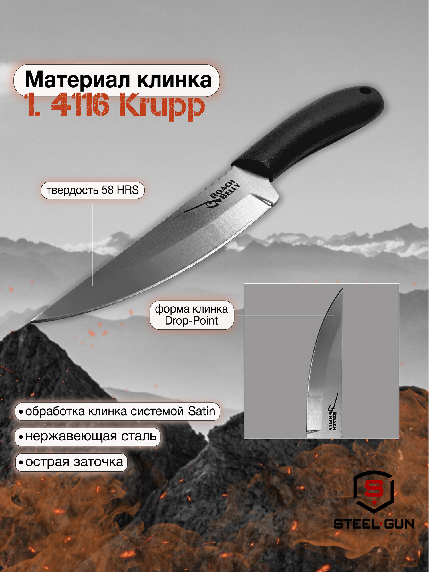 | Дополнительная информация | толщина лезвия 2,5 мм.; Lanyard Hole — отверстие в рукояти ножа для страховочного корда; рукоять выполнена из полипропилена с высокой устойчивостью к разрушениям и температурам; марка стали: 1.4116; твердость стали, HRC: 56-58; чехол в комплекте |
