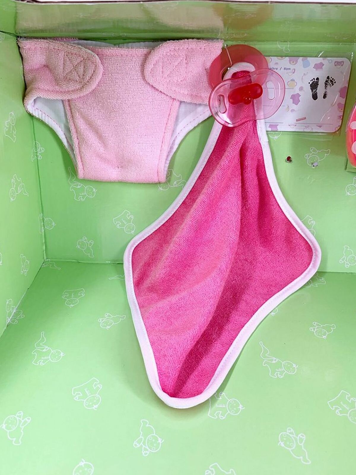 | Комплектация | - пупс; - розовый тканевый памперс; - небольшое полотенце; - соска; - погремушка; - расческа; - бутылка; - 2 браслета; - сертификат; -ванночка для купания. |