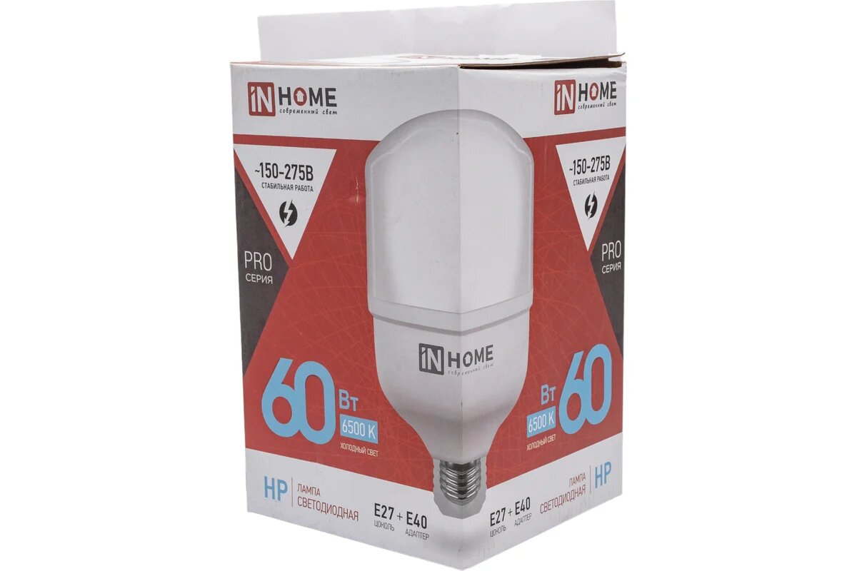 Лампа светодиодная IN HOME LED-HP-PRO, 60 Вт, 230 В, Е27, E40, 6500 К, 5700 Лм, с адаптером