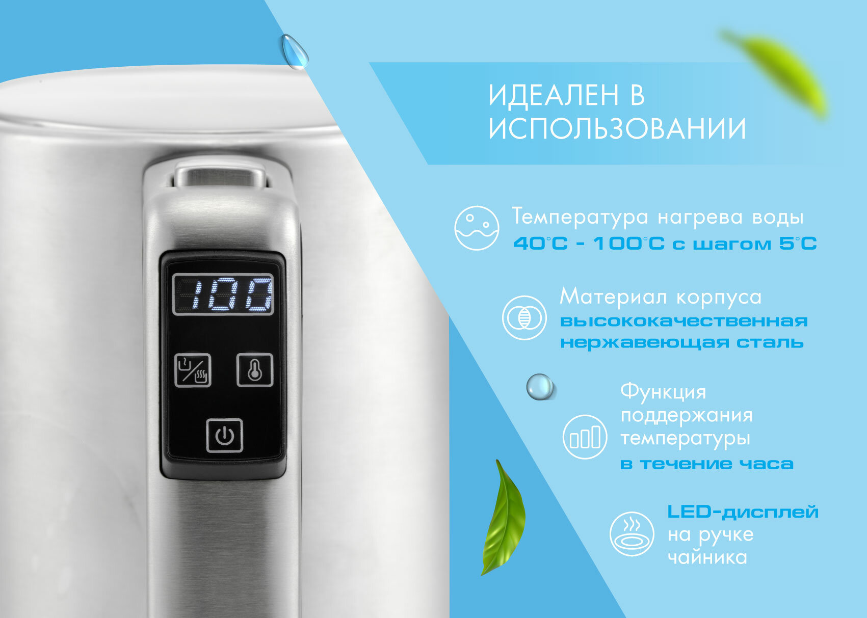 | Дополнительная информация | защита от перегрева, автоматическое / ручное выключение; выбор температуры нагрева воды: 40°С - 100°С с шагом 5°C; LED-дисплей на ручке чайника |