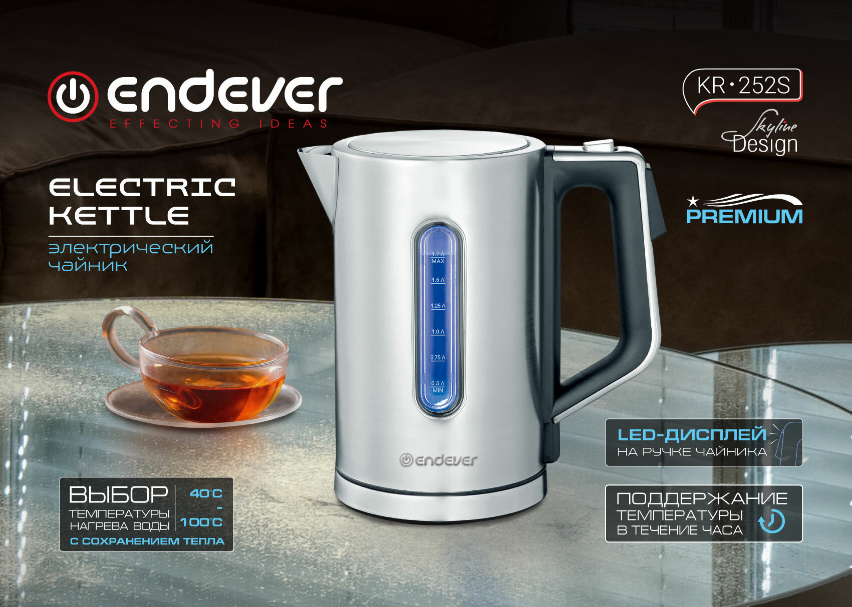 Чайник электрический стальной Endever KR-252S / 1,7л / 2200 Вт / выбор температуры нагрева воды / LED дисплей