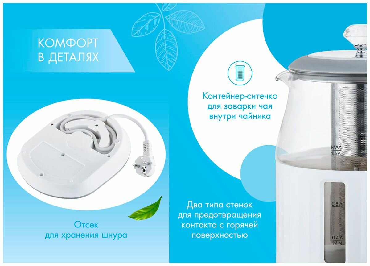 | Дополнительная информация | контейнер-ситечко для заварки чая внутри чайника, кнопочная панель управления, эргономичная ненагревающаяся ручка, автоотключение при закипании, два типа стенок для предотвращения контакта с горячей поверхностью |