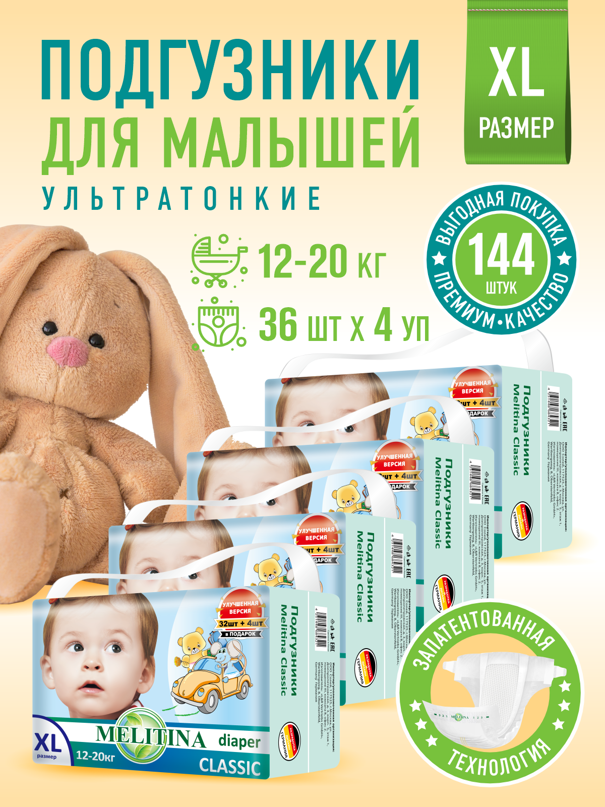 Подгузники для детей Melitina Classic Памперсы детские для малышей размер XL, 5, 12-20 кг, 144 штуки интересное: