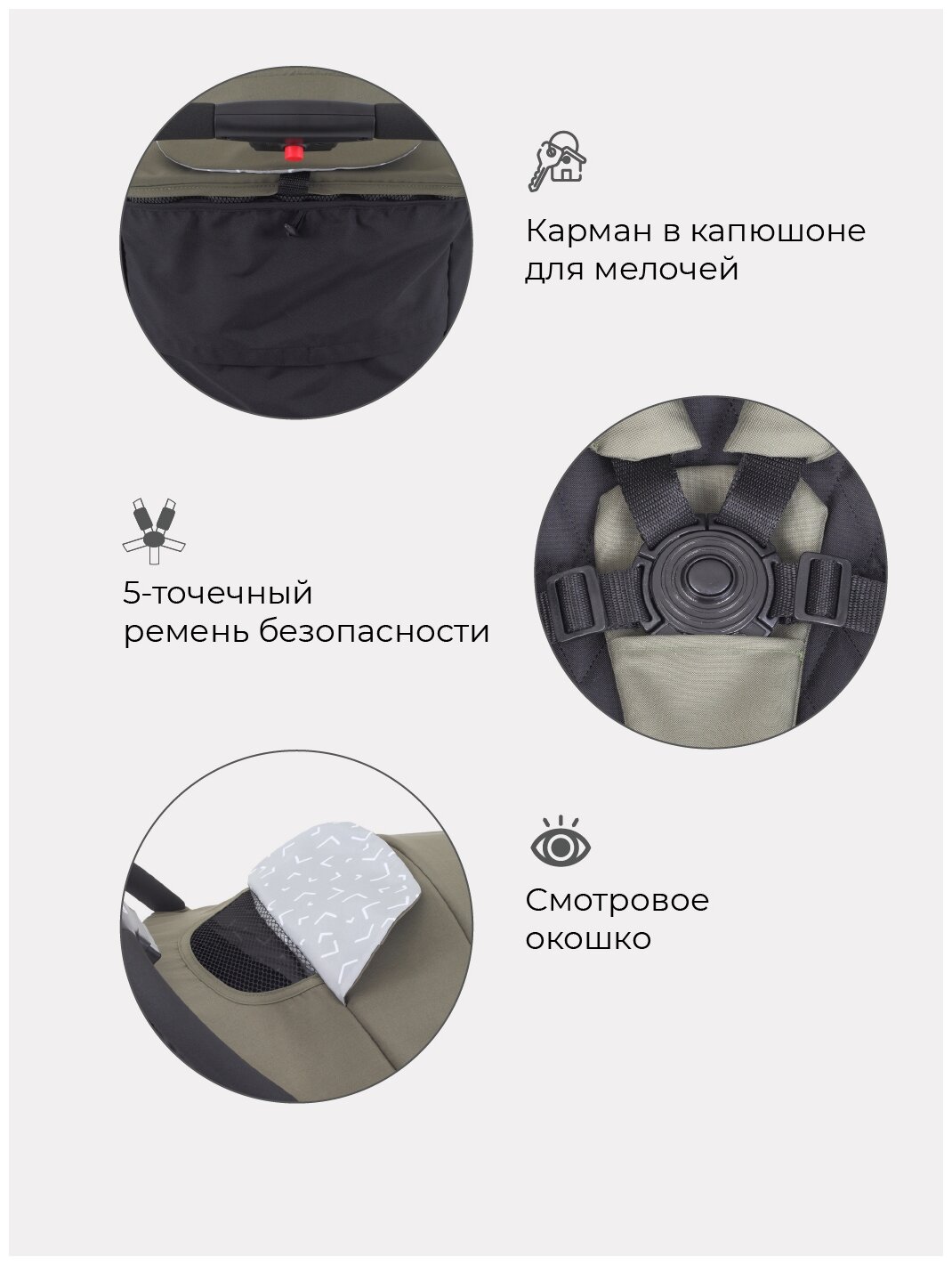 | Особенности | съемный бампер, ремни безопасности, горизонтальное положение спинки, регулировка высоты подножки, мягкие накладки на ремни, смотровое окно |