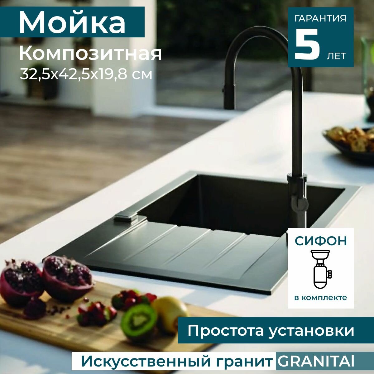 Мойка ALVEUS GRANITAL CADIT 10 CARBON - G91 590 X 500 1X в комплекте с сифоном 1132823, Alveus черный