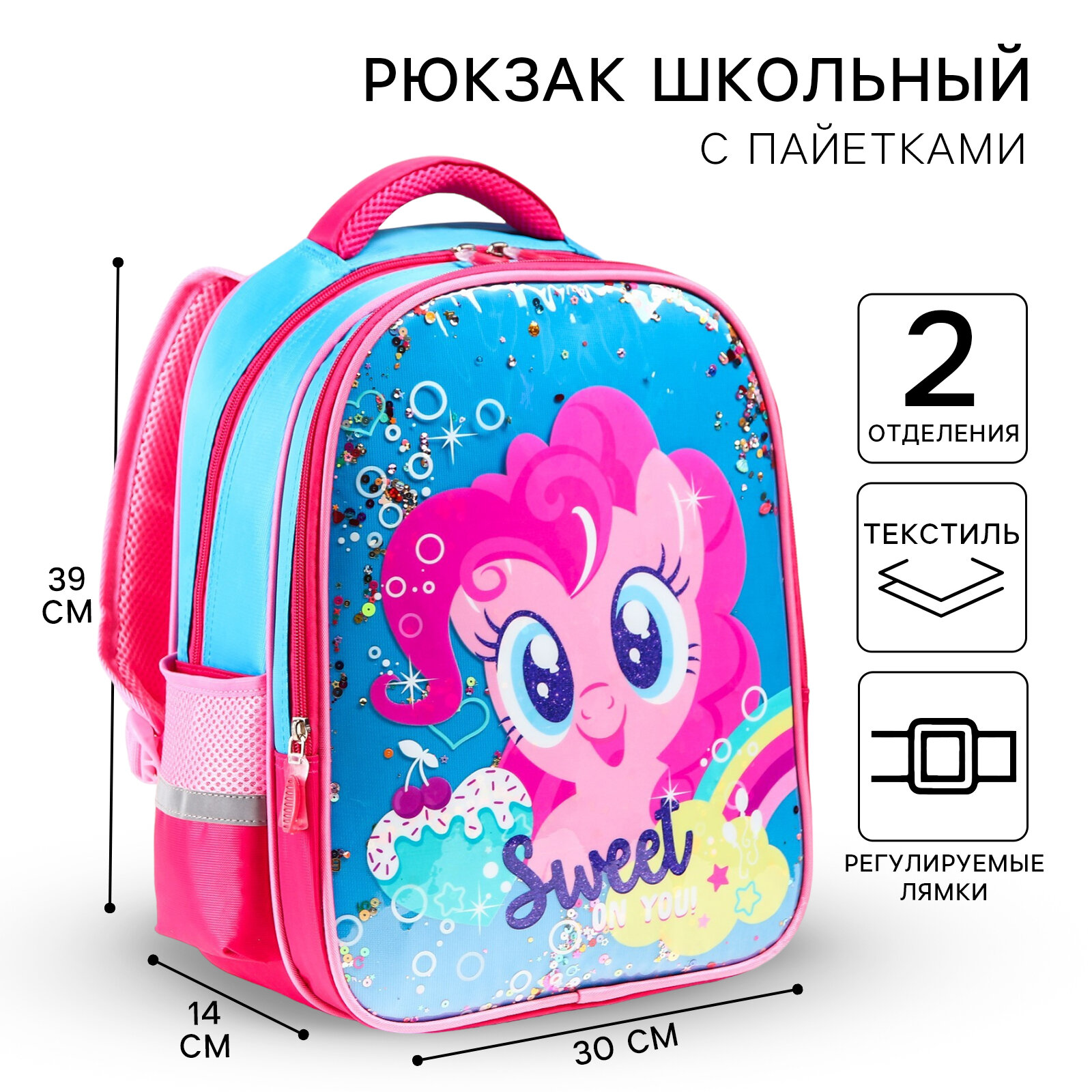 Рюкзак школьный, 39 см х 30 см х 14 см "Пинки Пай"