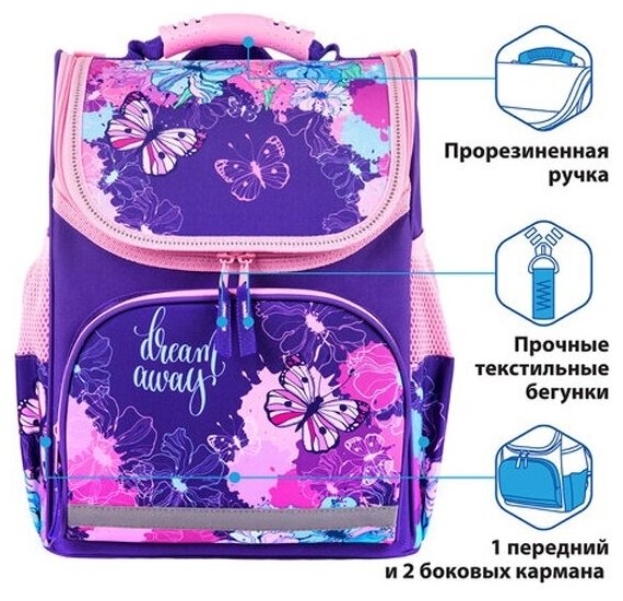 Ранец ортопедический школьный Пифагор для девочки, Basic, с эргономичной спинкой "Butterflies" 35х28х18 см (270683)