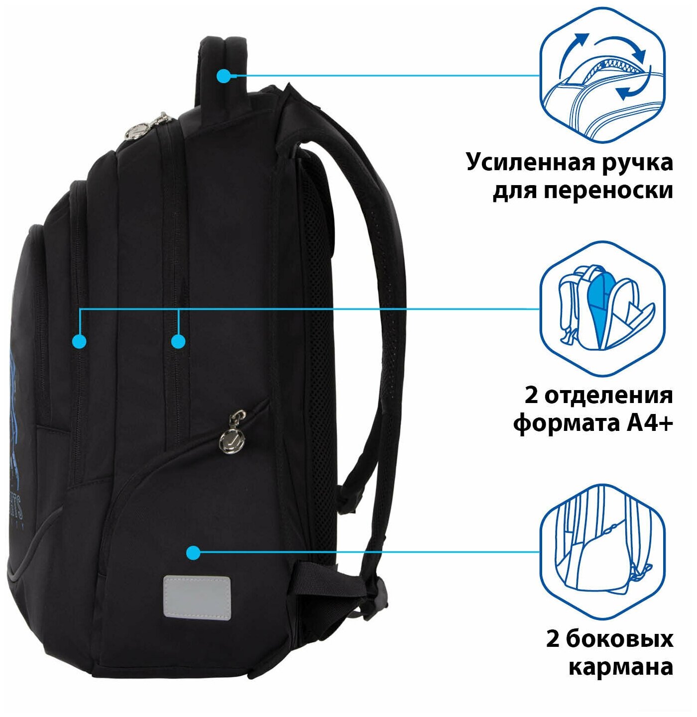 | Особенности | эргономичная спинка / ручка для переноски / светоотражающие элементы / водоотталкивающая пропитка / вентилируемые лямки / вентилируемая спинка / без наполнения / разделитель в главном отделении / регулируемые лямки |