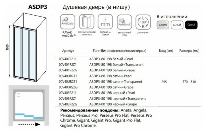 Душевая дверь Ravak Supernova ASDP3-80 198 белая Grape интересное: