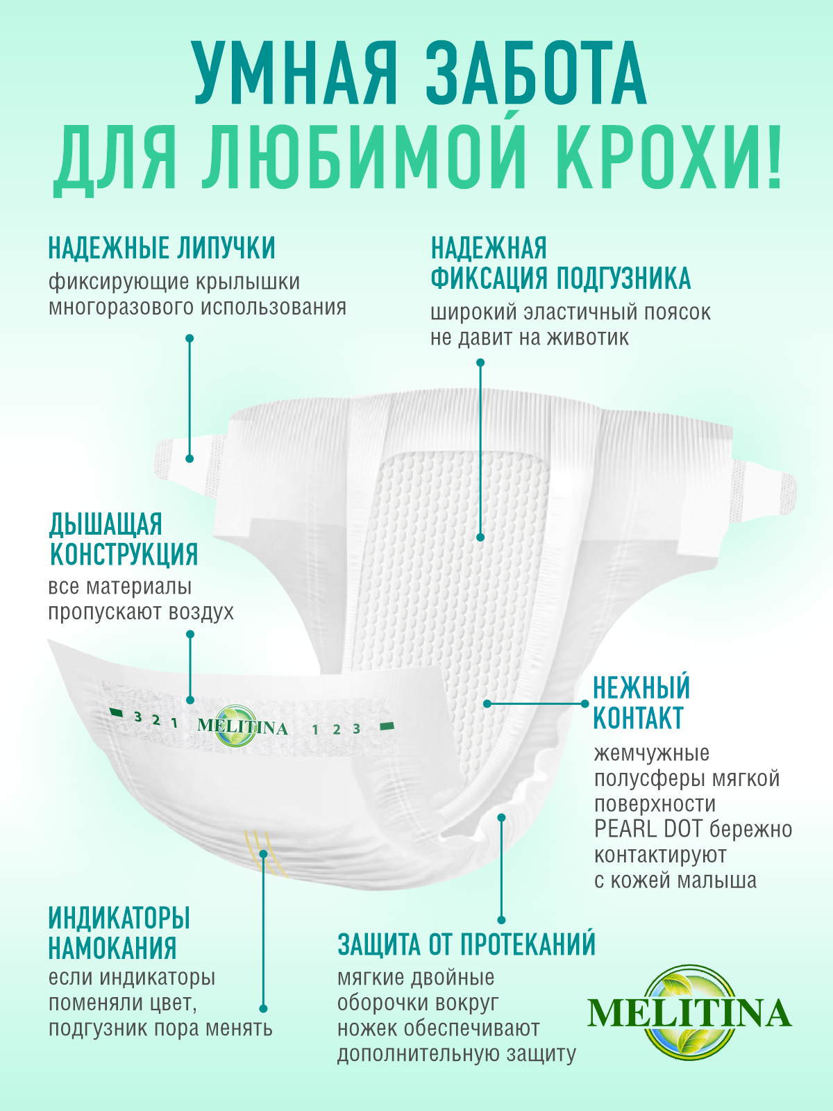 | Особенности | эластичные резинки вокруг ножек / многоразовые застежки-липучки / эластичный пояс / индикатор наполнения / рельефная внутренняя поверхность |