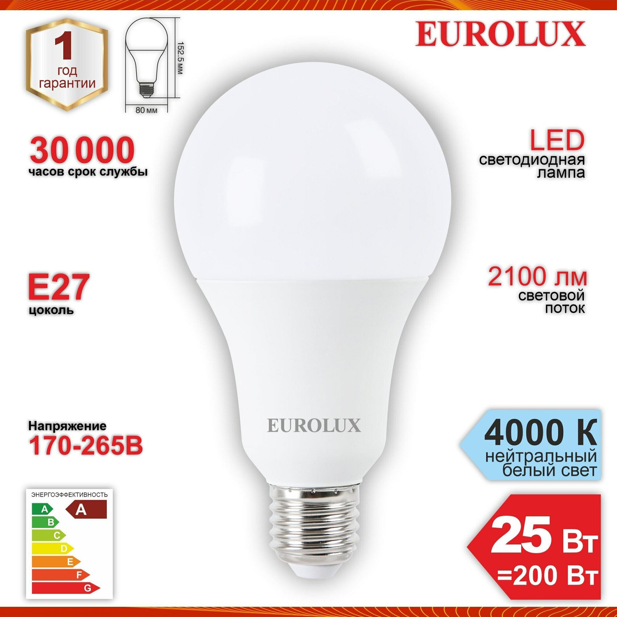 Светодиодная лампа Eurolux LL-E-A80-25W-230-4K-E27 (груша, 25Вт, нейтр, Е27), 76/2/76