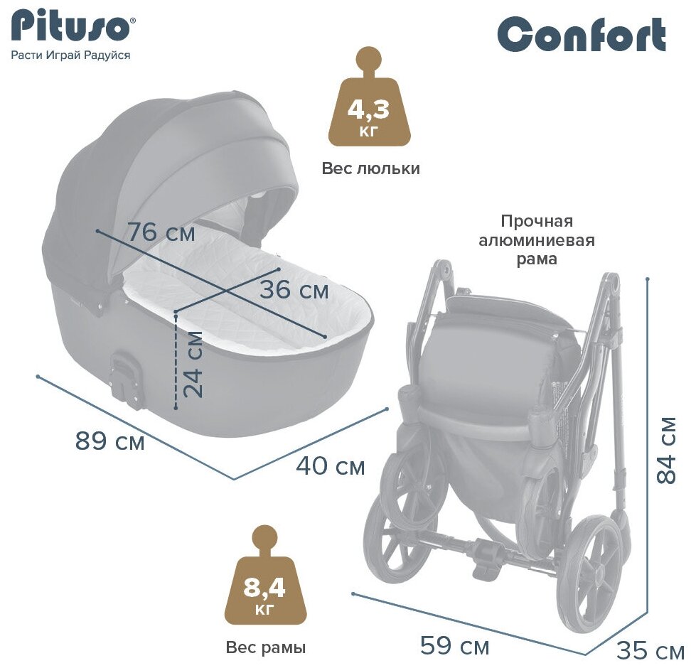 Коляска 2 в 1 Pituso Confort 2020 гелевые колеса плюс Серый+Кожа Тем.Серый/Рама Черная/Гель.колеса плюс