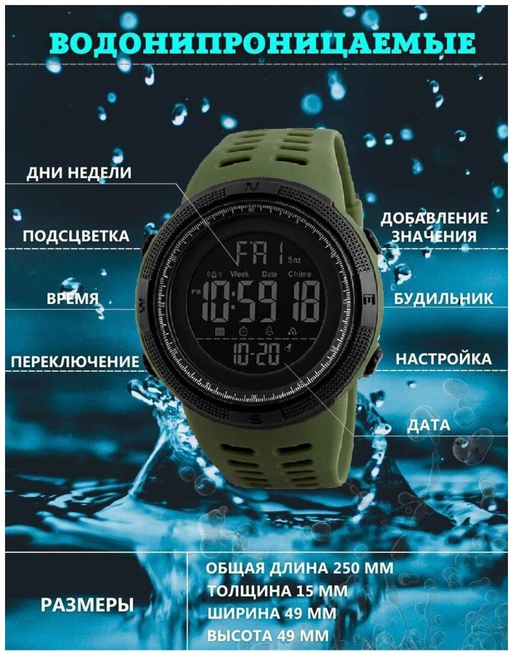Часы мужские SKMEI 1251, водонепроницаемые, цвет зеленый милитари. Часы электронные.