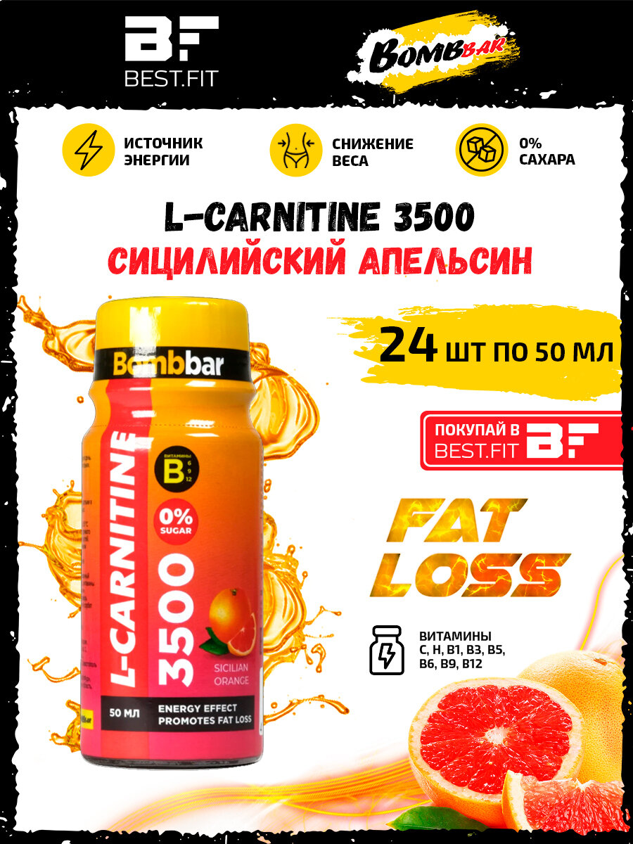 Купить Bombbar Жидкий L-Карнитин L-Carnitine, 24х50 мл (3500 мг) Апельсин / Жиросжигатель для похудения женщин и мужчин