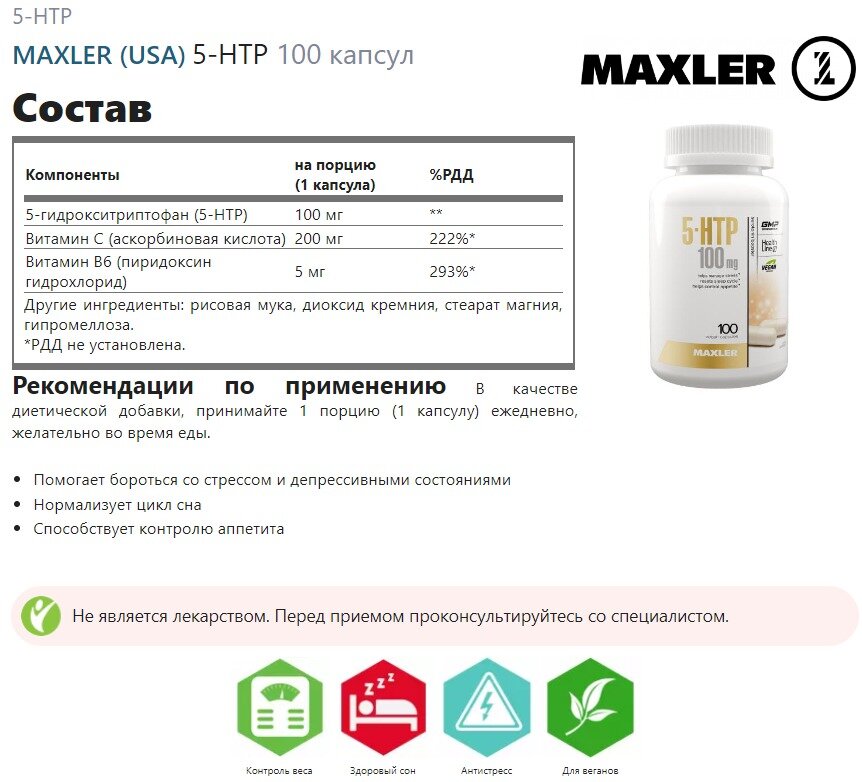 5-HTP MAXLER (USA) 5-HTP 100 капсул интересное: