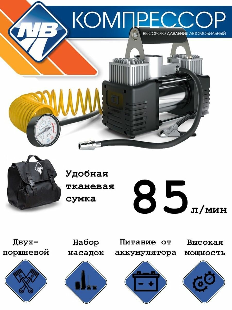 Компрессор автомобильный Nova Bright, двухпоршневой, в сумке, 85 л/мин, 12 В