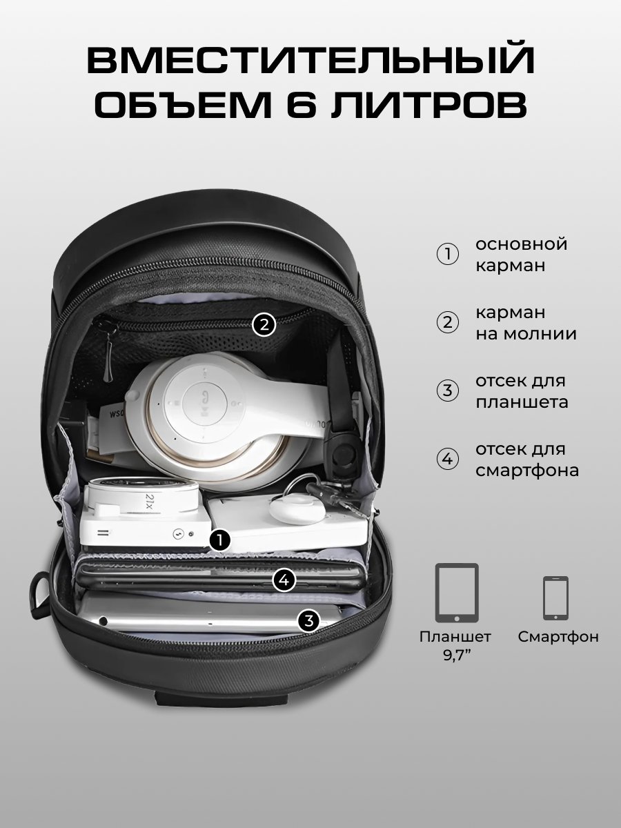 Рюкзак мужской городской небольшой 6л для планшета 9.7 через плечо Mark Ryden MR7507 Черный влагостойкий с USB портом молодежный