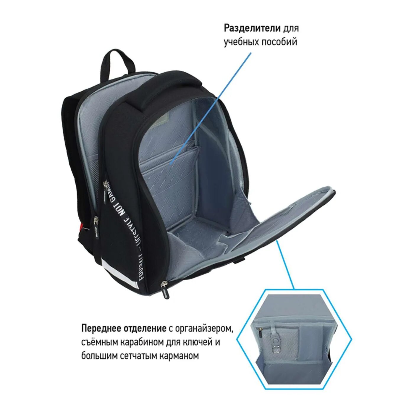 | Особенности | ножки / эргономичная спинка / ручка для переноски / светоотражающие элементы / карабин для ключей / водоотталкивающая пропитка / вентилируемая спинка / разделитель в главном отделении / грудная стяжка / регулируемые лямки / жесткое дно |