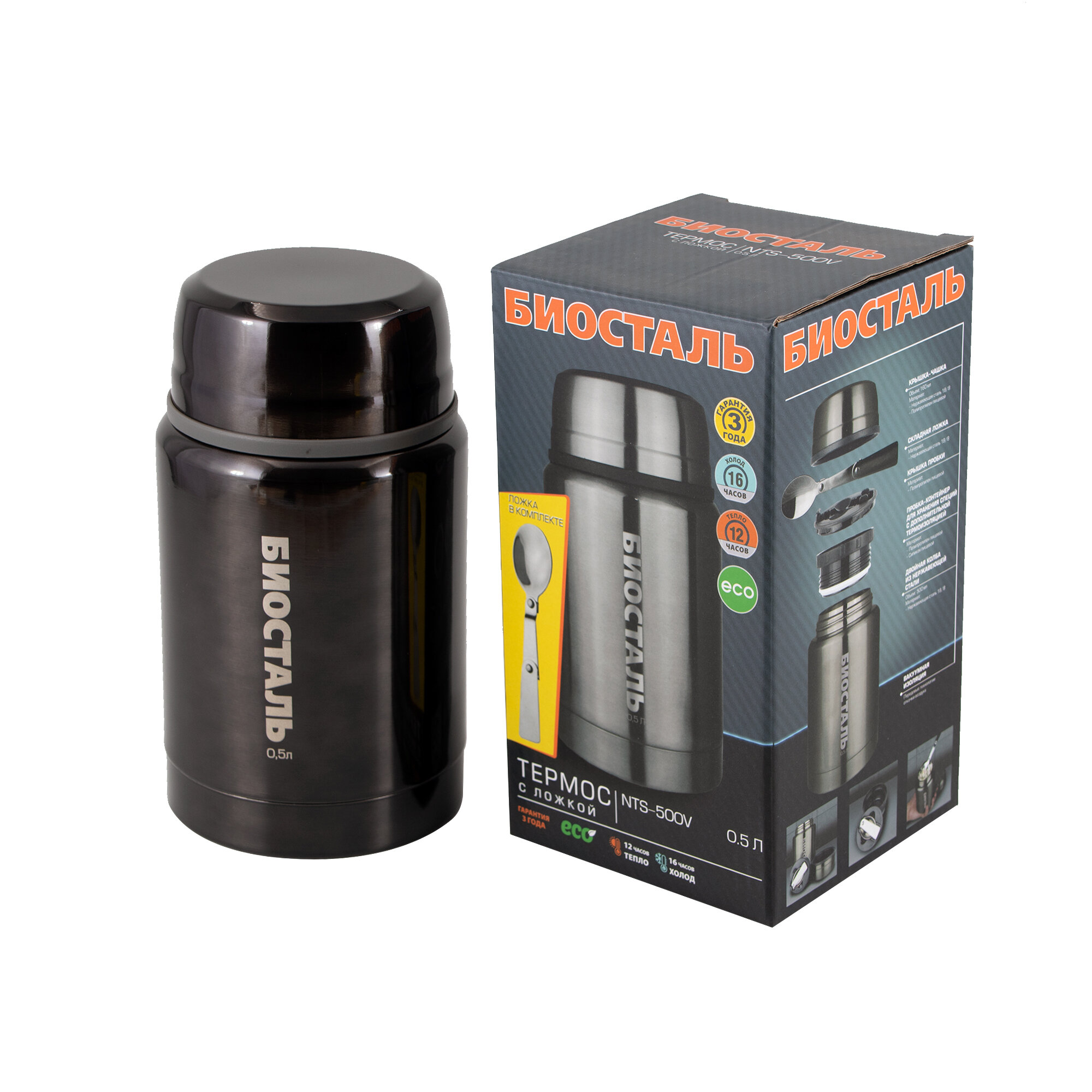 Термос Biostal с широкой горловиной, суповой, цвет "вороненая Сталь", 0.5 л. С Ложкой Nts-500v
