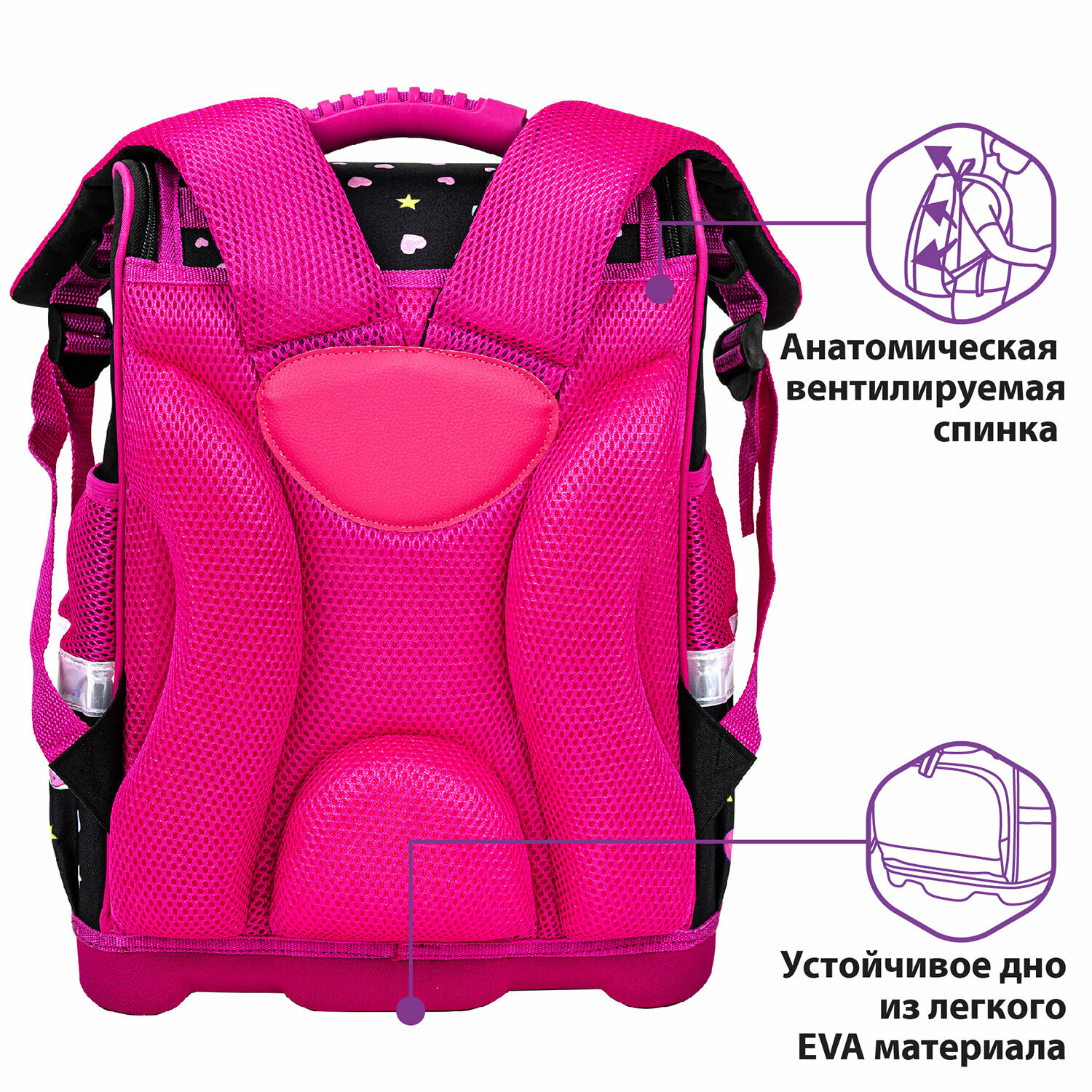 | Особенности | эргономичная спинка / ручка для переноски / светоотражающие элементы / вентилируемые лямки / вентилируемая спинка / без наполнения / разделитель в главном отделении / верхний клапан / регулируемые лямки / жесткое дно |