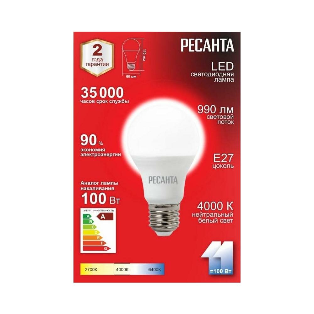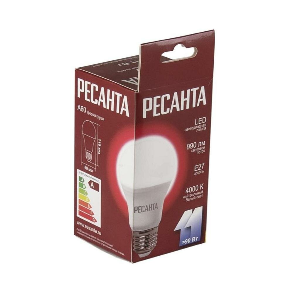 Лампочка Ресанта LL-R-A60-11W-230-4K-E27 (груша, 11Вт, нейтр, Е27) белый