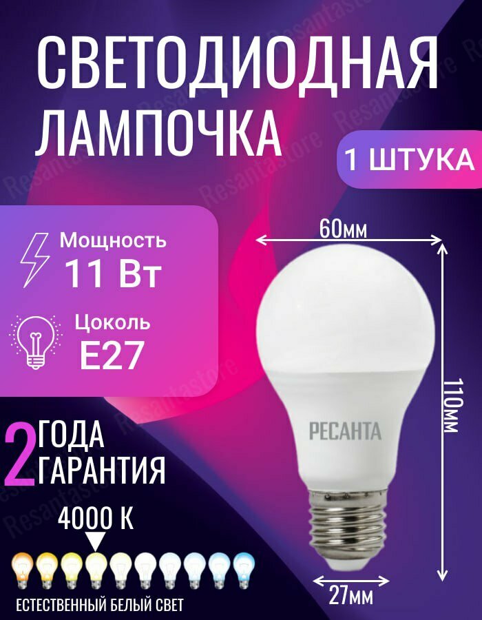 Ниже Вы можете прочитать отзывы на Лампа светодиодная РЕСАНТА LL-R-A60-11W-230-4K-E27, ознакомится с подробными характеристиками, посмотреть интересные обзоры и фотографии на Лампа светодиодная РЕСАНТА LL-R-A60-11W-230-4K-E27.
