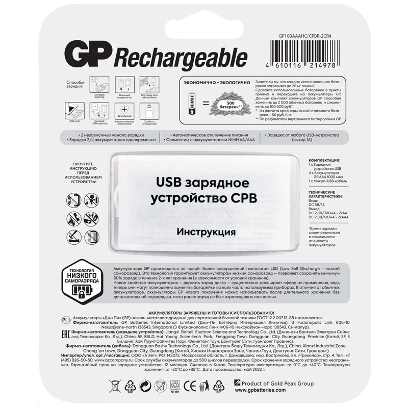 Зарядное устройство GP, в комплекте 4 аккумулятора AAA(HR03)1000mAh, для 4 тип АА/ААА, микроUSB кабель, GP 100AAAHC/CPBR-2CR4
