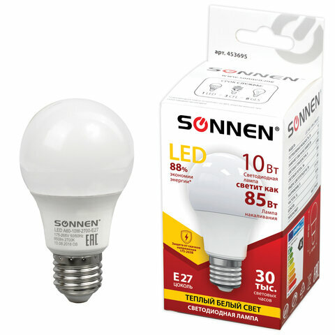 Лампа светодиодная SONNEN, комплект 200 шт., 10 (85) Вт, цоколь Е27, грушевидная, теплый белый свет, 30000 ч, LED A60-10W-2700-E27, 453695 интересное: