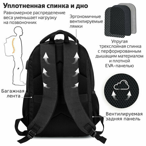 270798, Рюкзак BRAUBERG URBAN универсальный с отделением для ноутбука, USB-порт, "Kinetic", черный, 46х31х18 см, 270798