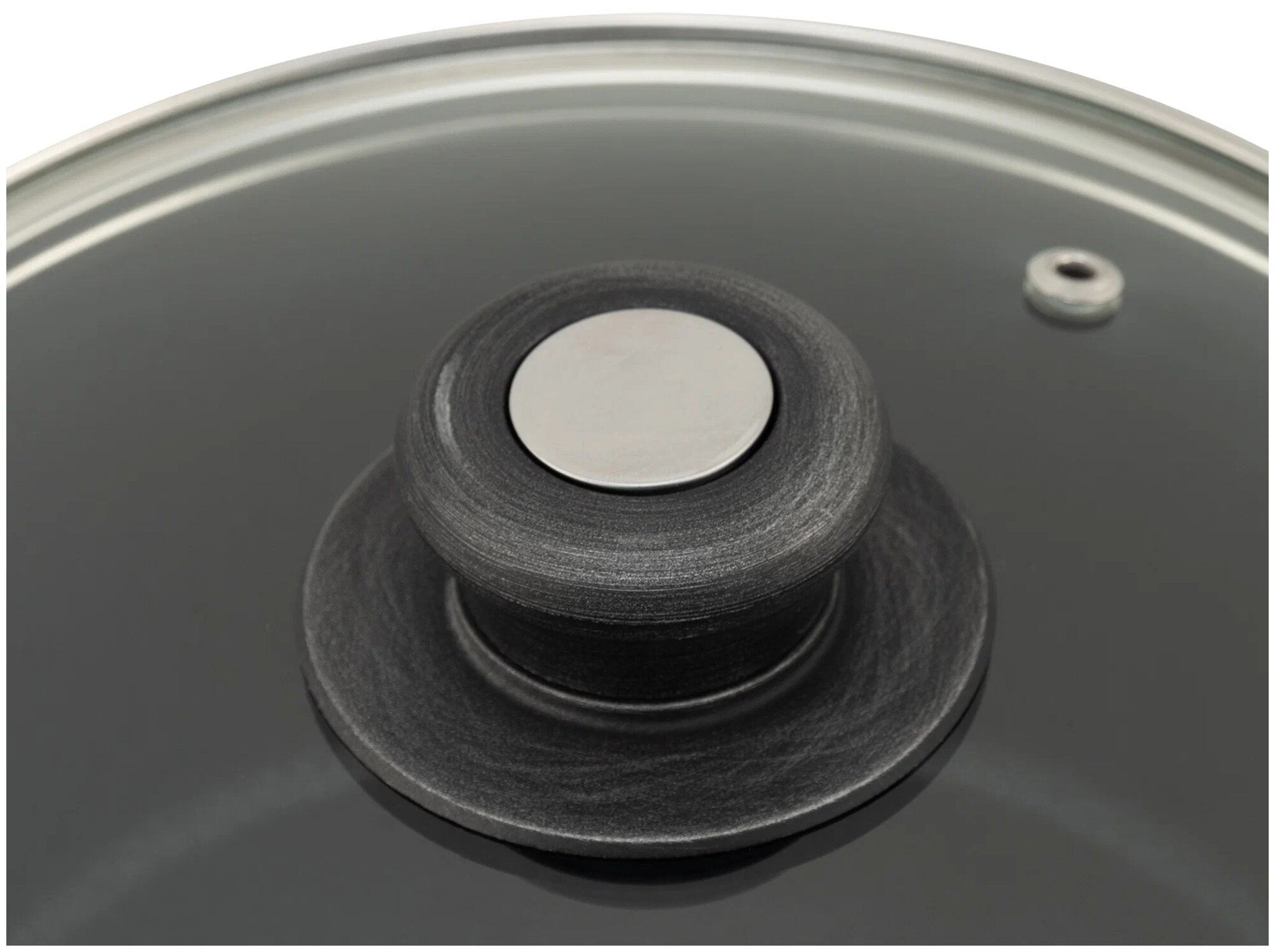 Крышка из прочного стекла с отверстием для выпуска пара. Ручки немного под старину как -то сделаны под серебро. Смотрится красиво |