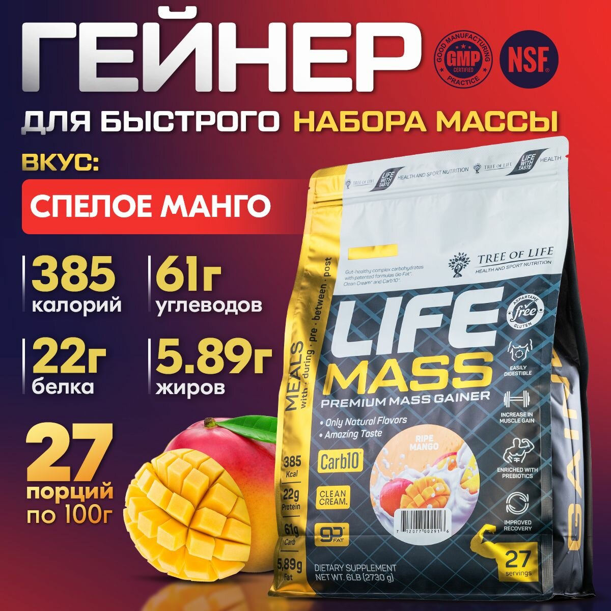 Комплекс Гейнер Tree of life Mass GAINER 6LB вкус Манго + Креатин моногидрат 150 гр. в подарок