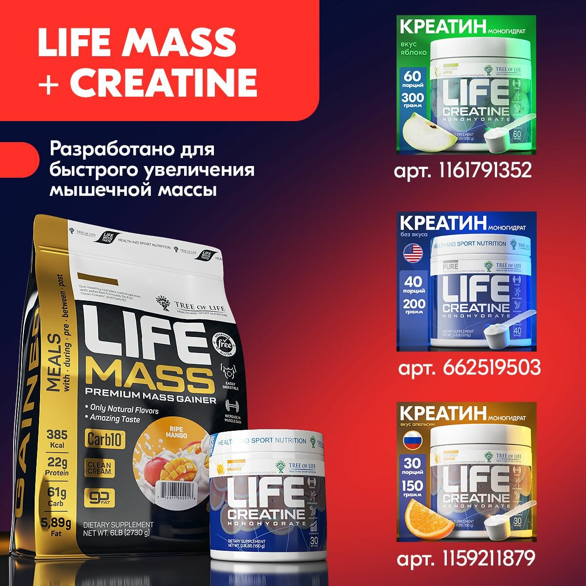 Гейнер Tree of life 6LB Дыня + Креатин моногидрат 150 грамм / Комплекс спортивного питания для набора мышц