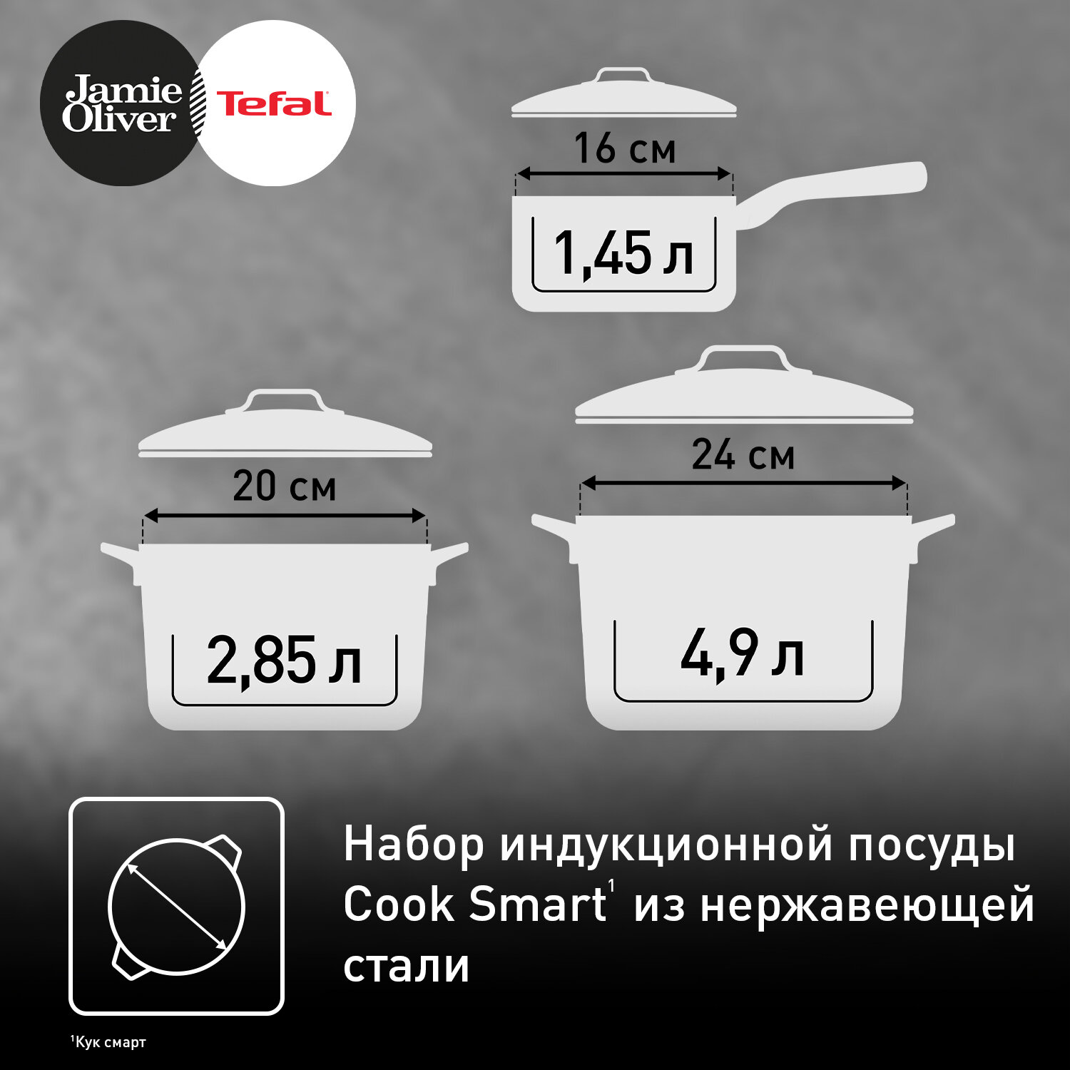 Набор посуды из нержавеющей стали Tefal E311S674 Jamie Oliver Cook Smart 6 предметов, кастрюли и ковши для газовых, электрических и индукционных плит