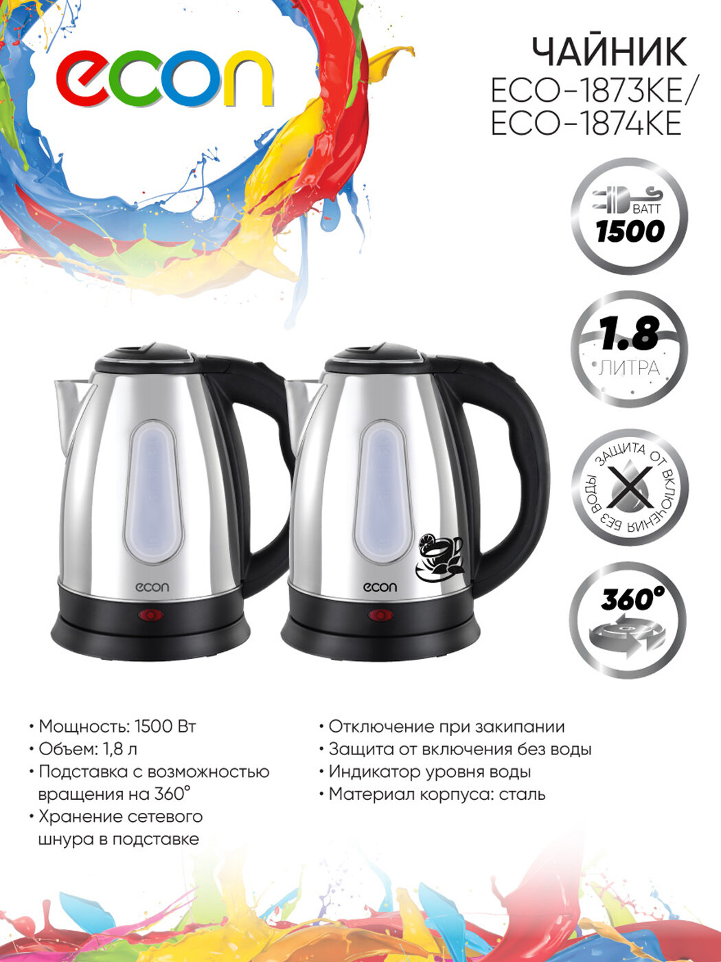 Чайники электрический econ Eco-1874ke нержавейка econ Eco-1874ke .
