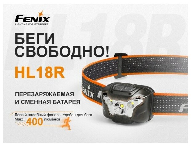 Фонарь светодиодный налобный Fenix HL18R, черный, 400 лм, аккумулятор