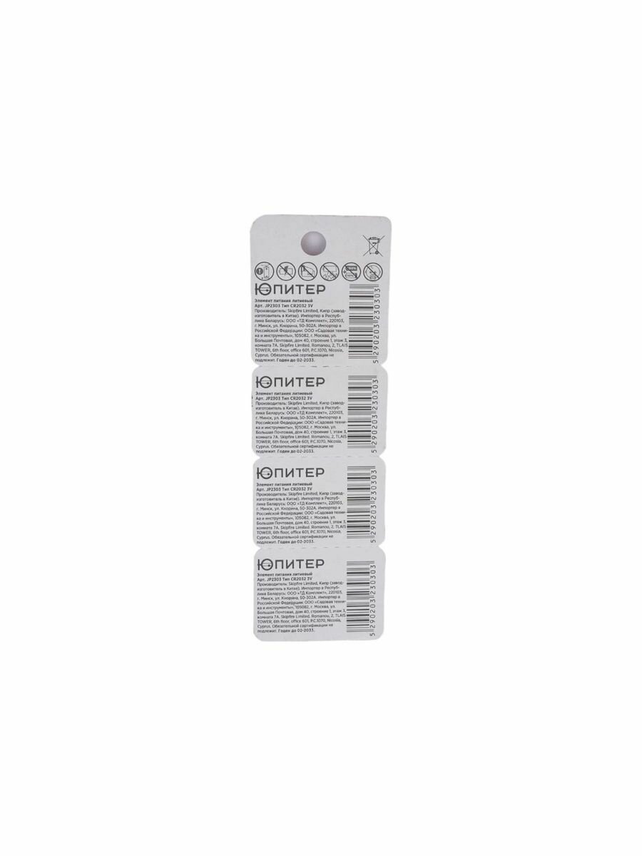 Батарейка CR2032 3V lithium 4шт. Юпитер (блистер с линиями отрыва) (JP2303) интересное: